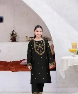 2 Pcs Girl’s Linen Embroidered Kurta And Shalwar Suit