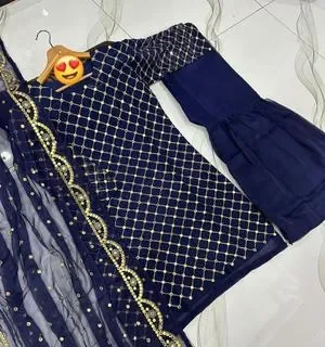 Front and Sleeves 9MM Sequence Embroidered Shirt, And Cut Work 9MM Dupatta with Garara 3Piece Size Measurements Chest 20/ 21 Shirt Length 37 Stuff Chiffon (Crepe Inner Attached) Garara Length 39 Stuff ( Chiffon With Crepe Inner Attached) Cut Work 9MM work Dupatta Stuff Chiffon Size 2.25 Yards