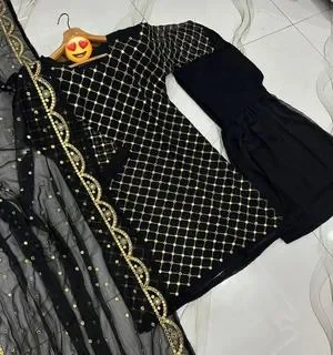 Front and Sleeves 9MM Sequence Embroidered Shirt, And Cut Work 9MM Dupatta with Garara 3Piece Size Measurements Chest 20/ 21 Shirt Length 37 Stuff Chiffon (Crepe Inner Attached) Garara Length 39 Stuff ( Chiffon With Crepe Inner Attached) Cut Work 9MM work Dupatta Stuff Chiffon Size 2.25 Yards