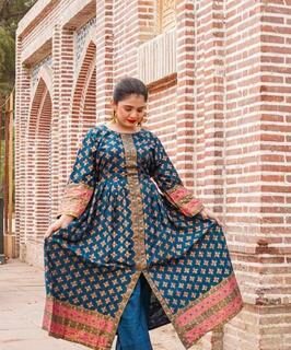 The round neck and flared silhouette offer a flattering fit for all body types, while the embroidered details enhance its stylish appeal. The medium-length shirt and matching trousers are thoughtfully designed for ease of movement and a polished look. Whether you’re attending a formal gathering or a casual get-together, this set delivers both sophistication and practicality. The vibrant colors and detailed patterns make it a standout choice for any occasion.