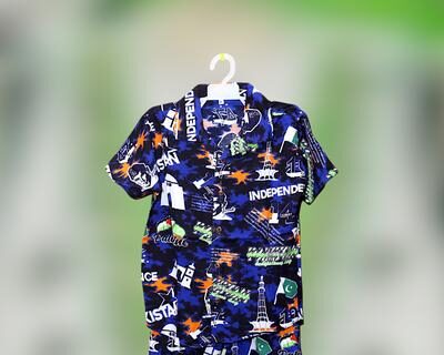 Made from premium quality Dhanak material, this set is designed to be durable and long-lasting, resisting wear and tear even with frequent use. The vibrant blue base with patriotic prints of the Pakistani flag, Independence Day motifs, and iconic landmarks makes it a standout choice. The short-sleeved shirt and matching shorts are crafted for ease of movement and comfort, perfect for active kids. The design is not just eye-catching but also practical for everyday wear.