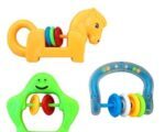 This adorable rattle set is perfect for your little one’s early development stages, designed with vibrant colors and a cheerful smiley face that captures your baby’s attention instantly. Made from premium quality ABS plastic, it’s non-toxic, skin-friendly, and built to last through daily playtime in Pakistan’s warm climate. The stylish design not only entertains but also helps strengthen your baby’s sensory and motor skills as they grasp, shake, and explore the different textures and shapes.