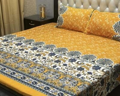 Made from premium quality crystal cotton, this bedsheets set is both durable and breathable, making it suitable for all seasons. The intricate floral and paisley patterns in rich yellow, navy, and white tones bring a vibrant, stylish look to any room. The fabric is soft to the touch and resistant to fading, ensuring your investment stays fresh for years. The double bed size fits perfectly, and the included pillow covers match seamlessly for a coordinated look.