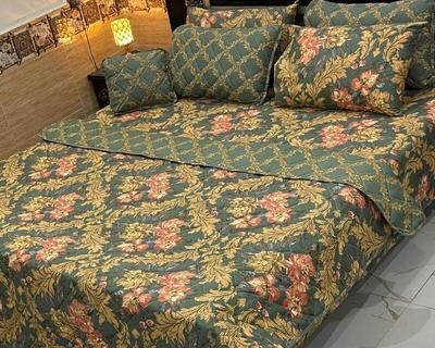 Upgrade your bedroom instantly with this stunning 7-piece Cotton Salonica Printed Comforter Set. Designed for Pakistani homes, it offers both elegance and comfort, making it perfect for daily use or special occasions like weddings and Eid. The rich green base with vibrant floral patterns adds a touch of luxury to any room, while the durable cotton material ensures long-lasting use even in our warm climate.