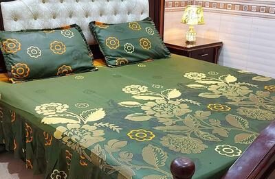 Add elegance to your bedroom with this stunning 3-piece cotton salonica bedding set, perfect for Pakistani homes seeking both style and comfort. Designed for all seasons, this durable and stylish bedsheet set is ideal for daily use and special occasions like weddings or festive gatherings. The rich green base with golden floral patterns adds a touch of sophistication to any room, while the 2-sided frill design ensures a luxurious look from every angle. Made from premium quality cotton salonica, this set is breathable, soft, and long-lasting, making it a smart investment for your home.