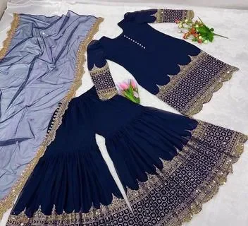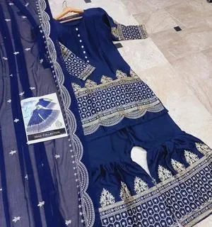 This stunning 3-piece suit is crafted for the modern Pakistani woman who demands both elegance and comfort. Perfect for Eid, Ramadan, or any festive occasion, it combines traditional embroidery with contemporary styling to make you stand out. The deep blue color exudes sophistication, while the shimmering gold detailing adds a touch of luxury thatâs ideal for celebrations or formal gatherings.