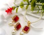 Crafted with high-quality metal and gold plating, this set is built to last. The Kundan stones add a touch of antique charm while the pearl beads provide a classic, graceful finish. The adjustable 18-inch length ensures a perfect fit for all body types, making it easy to wear and maintain. Whether you’re attending an Eid celebration or a formal gathering, this set enhances your look with its vibrant red hue and intricate detailing.