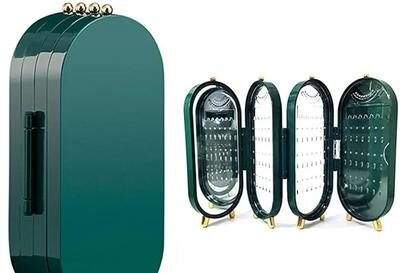Made from high-grade aluminium, this box is built to withstand daily use and maintain its sleek finish. The green hue is both modern and elegant, making it a standout piece in any room. Its compact, foldable design saves space while offering easy access to your favorite pieces. The interior features multiple compartments and hooks for secure storage, ensuring your jewelry stays protected and visible.