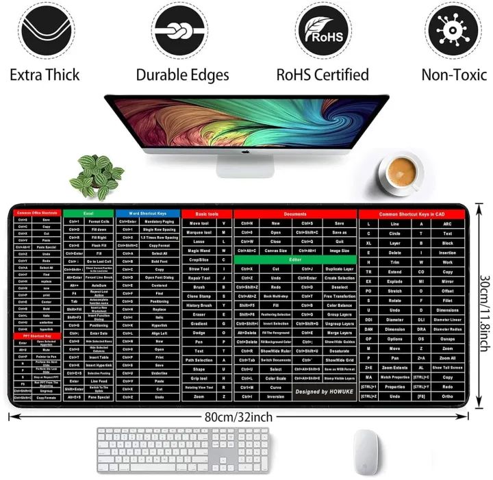 - Super Large Size?Boasting generous dimensions of 300 x 800 mm (11.8 x 31.5 in), the Keyboard Shortcuts Mouse Mat fits comfortably on desks of all sizes.