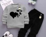 Made from premium quality fleece, this tracksuit is durable enough to withstand daily wear and tear. The printed heart and butterfly design adds a playful touch while keeping the look modern and stylish. The grey shirt pairs beautifully with the black trousers, creating a timeless look that’s easy to match with shoes or accessories. The fabric is breathable and gentle on sensitive skin, making it suitable for active kids.