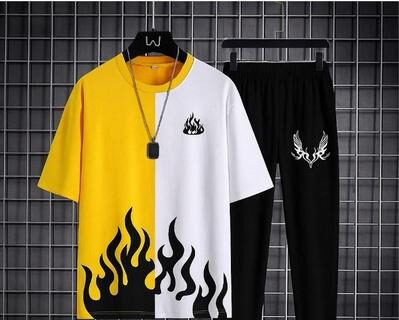 This stylish 2-piece track suit is perfect for the hot Pakistani summers and festive occasions like Eid. The bold yellow and white flame design on the t-shirt adds a trendy, eye-catching look that’s ideal for casual outings or parties. The black trousers with a white winged emblem complete the modern, sporty vibe. Made from premium quality polyester, this set is both durable and comfortable, ensuring you stay cool and confident all day.