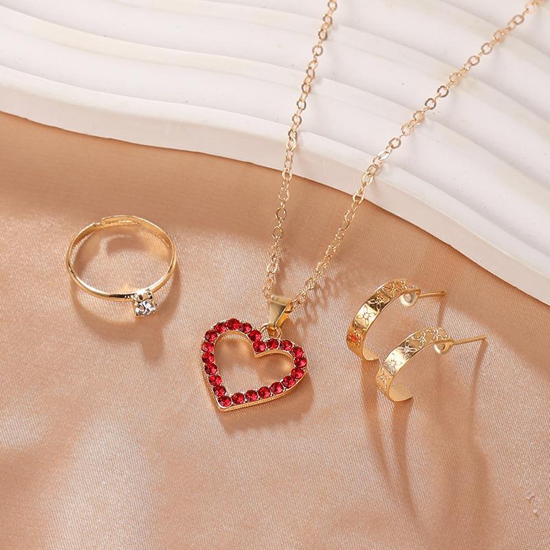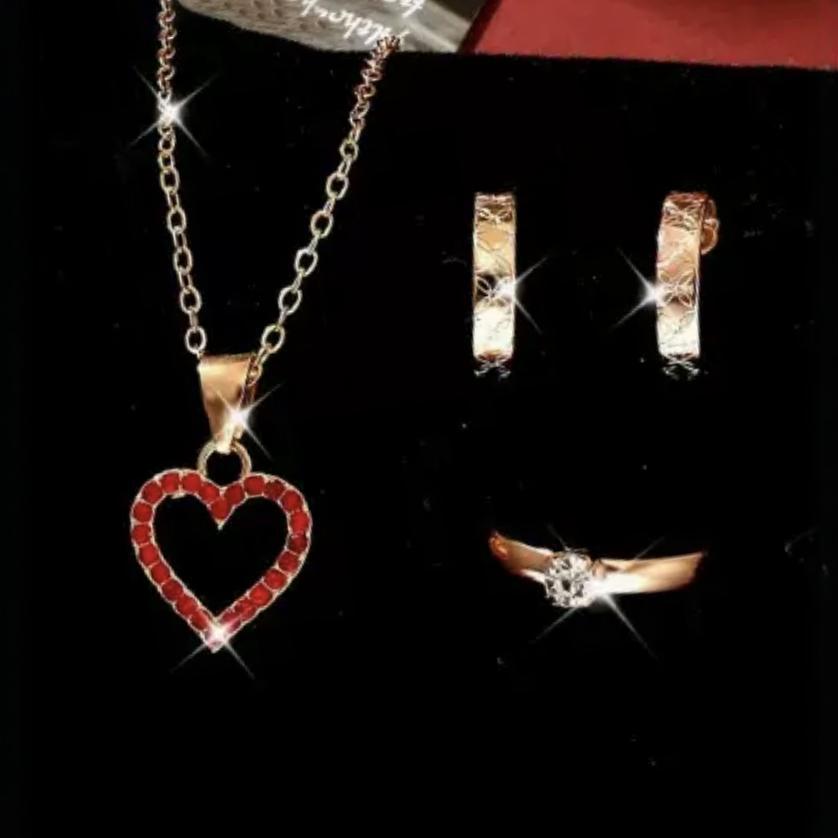 - 3pcs Red stone Heart Jewelry Set, Necklace , Ring & Earrings