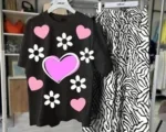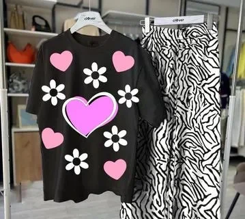 The round-neck shirt and flared trousers are crafted with care for a flattering fit. The jersey material is gentle on the skin, making it suitable for sensitive skin types. The suit is designed for easy movement and is perfect for lounging, sleeping, or casual outings. The black base color is versatile and pairs well with any home decor or occasion. The stitching is precise, ensuring long-lasting quality.