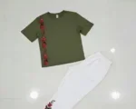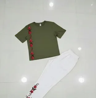 Perfect for cozy nights at home or casual outings, this 2-piece night suit blends comfort with a touch of elegance. The olive green shirt features a stunning vertical floral embroidery with red roses and dark green leaves running down the left side, adding a stylish flair to your loungewear. Paired with the crisp white trousers, which also boast matching red rose embroidery near the ankle, this set offers a fresh, modern look. Crafted from premium quality soft jersey fabric, it ensures maximum comfort and breathability, making it ideal for Pakistanâs warm weather. The design is both durable and stylish, perfect for daily wear or special occasions like weddings or formal gatherings.