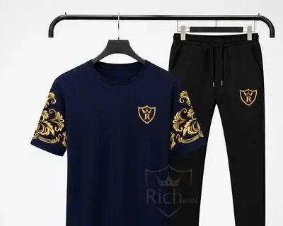 : RichMan Royal Summer Tracksuit specially design kiya gaya hai un men ke liye jo comfort ke sath style compromise nahi karte. Is tracksuit ka soft breathable fabric garmiyon mein thandak ka ehsaas deta hai, jabke stylish printed sleeves aur signature logo isay premium look dete hain. Chahe aap casual outing par ho, walk pe ja rahe ho ya daily wear ke liye chahiye — ye T-shirt & trouser set har j