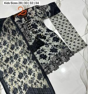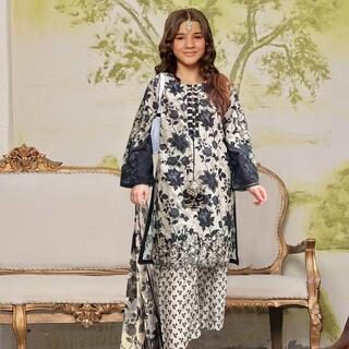 This elegant 3-piece suit is perfect for your little girl’s special occasions or everyday wear. Designed with a beautiful black floral print on soft Swiss Lawn fabric, it offers both comfort and style. The outfit includes a long-sleeved shirt, matching trousers, and a flowing dupatta, making it ideal for Eid, parties, or school events. The durable Lawn material ensures it stays fresh and comfortable even during long wear, while the stylish design keeps her looking chic and modern.