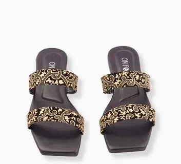 These elegant black slippers with gold paisley print are perfect for any occasion, from Eid gatherings to office wear, offering both comfort and style for the hot Pakistani summers. Designed for durability, the rexine material ensures long-lasting wear without compromising on comfort, making them ideal for daily use. The stylish design adds a touch of sophistication to your outfit while remaining lightweight and breathable.