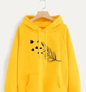 The vibrant yellow hue adds a cheerful pop to your wardrobe, while the printed feather and heart design gives it a unique, youthful vibe. Made with high-grade fleece, this hoodie is built to last, resisting pilling and maintaining its shape even after multiple washes. The hooded neck and front pocket offer practicality and style, while the relaxed fit ensures all-day comfort. Itâs a new arrival thatâs already a favorite among fashion-forward women.