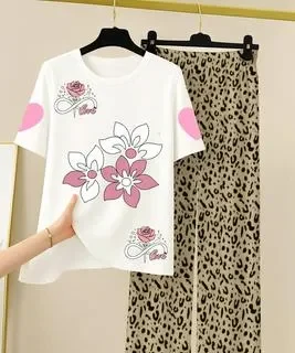Made from premium quality jersey, this set is durable enough for daily wear yet gentle on the skin. The white top features charming pink floral prints and heart motifs, while the leopard-printed trousers add a bold, modern flair. The relaxed fit and round neck design ensure maximum comfort, making it a favorite for women seeking both style and ease. The fabricâs softness and stretchability make it perfect for all-day wear, whether youâre at home or out for a casual stroll.