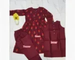 Elevate your wardrobe with this stunning Women’s Silk Embroidered Suit Set. This 3 Pcs set features a beautifully embroidered Kurta, paired with a matching Trouser and a Plain Inner Frock, all in a rich maroon hue. Perfect for special occasions, this ensemble offers luxury and comfort with its high-quality silk fabric.